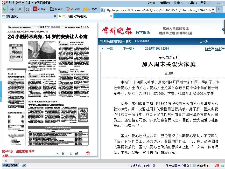螢火蟲愛(ài)心社成立發(fā)展至今已經(jīng)成為橫跨三省,擁有800余人的愛(ài)心團(tuán)體。本次愛(ài)心活動(dòng)共為受助家庭捐獻(xiàn)愛(ài)心基金5000元,同時(shí),這次的愛(ài)心活動(dòng)也得到了不少常州市愛(ài)心人士的關(guān)注與肯定?!冻V萃韴?bào)》也對(duì)本次愛(ài)心活動(dòng)予以了報(bào)道。
