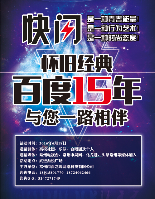 這一次,我們滿足你所有的想象,為了慶祝百度15周年,懷舊經(jīng)典,常州青之峰將開展百人快閃,現(xiàn)成員沸騰招募中,趕緊來報名吧!無論您是個人,還是團體,只要您對音樂、舞蹈、樂器感興趣,有一定的基礎,都可以加入我們,我們還將給予豐厚的報酬!
