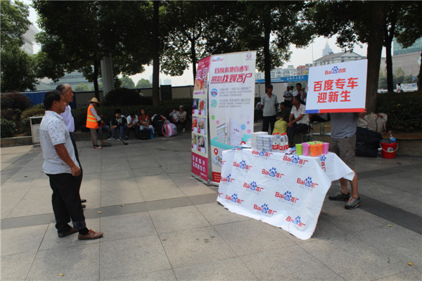 百度迎新站點準(zhǔn)備完成,我們的志愿者高舉“百度專車迎新生”字樣,以期吸引更多新生及家長的注意。同時,我們還安排專門的志愿者引導(dǎo)新生們上車、搬運行李,讓新生及家長們一下火車,就感受到了來自遠(yuǎn)方的溫暖及熱情。