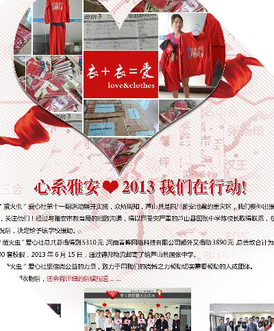 四川雅安地震發(fā)生后,青峰"螢火蟲"愛心社第一時間做出響應(yīng),決定為雅安災(zāi)區(qū)奉獻愛心。洛陽、新鄉(xiāng)、焦作、安陽四個地區(qū)的愛心社成員積極配合、踴躍捐助。 左圖為青峰"螢火蟲"愛心社焦作地區(qū)愛心會員募捐后,為雅安祈福加油!