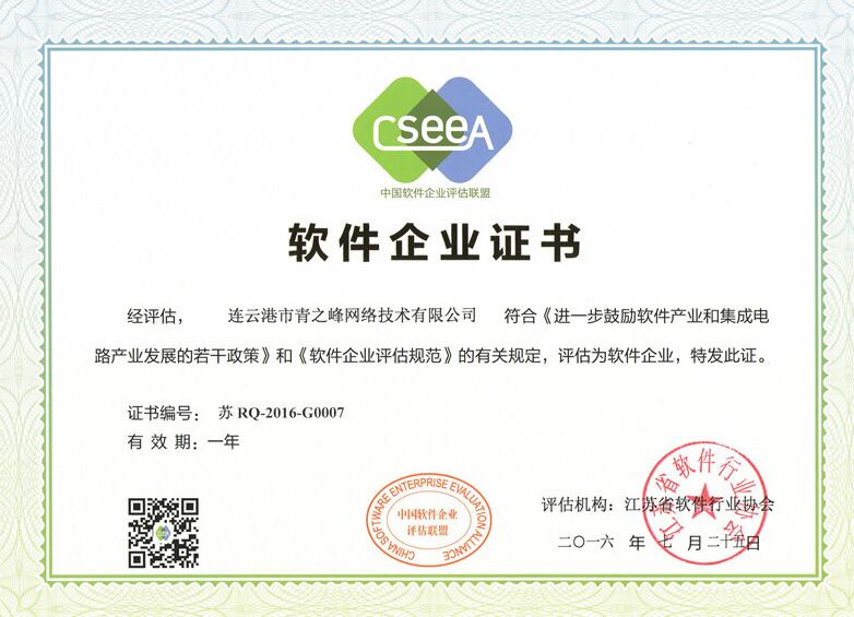 2016年7月底,我公司榮獲由江蘇省軟件行業(yè)協(xié)會頒發(fā)的《軟件企業(yè)證書》、《軟件產(chǎn)品證書》,通過了江蘇省雙軟企業(yè)認定。此次順利通過“雙軟認證”,是對連云港青之峰所有員工莫大的鼓舞,充分證明了公司軟件產(chǎn)品的開發(fā)技術(shù)力量、技術(shù)服務(wù)水平又上了一個新的臺階,也表明了我們得到了