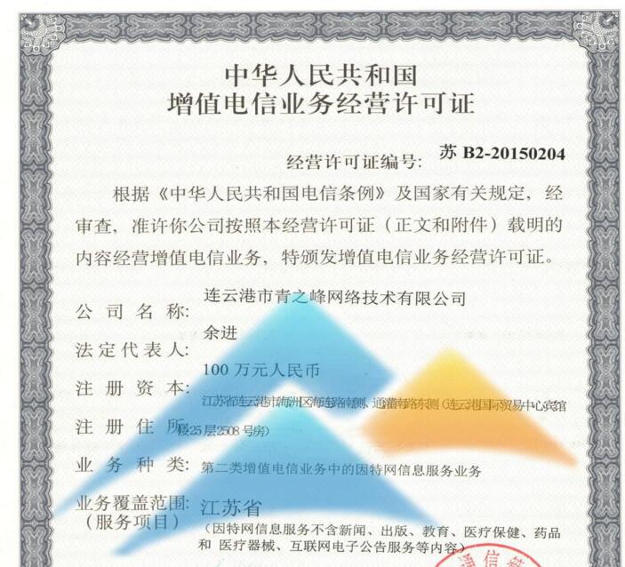 日前,連云港市青之峰網(wǎng)絡(luò)技術(shù)有限公司正式獲得江蘇省通信管理局頒發(fā)的中華人民共和國增值電信業(yè)務(wù)經(jīng)營許可證(蘇B2-20150204號),被獲準(zhǔn)經(jīng)營互聯(lián)網(wǎng)信息服務(wù)業(yè)務(wù)。 2000年9月25日,為了規(guī)范互聯(lián)網(wǎng)信息服務(wù)